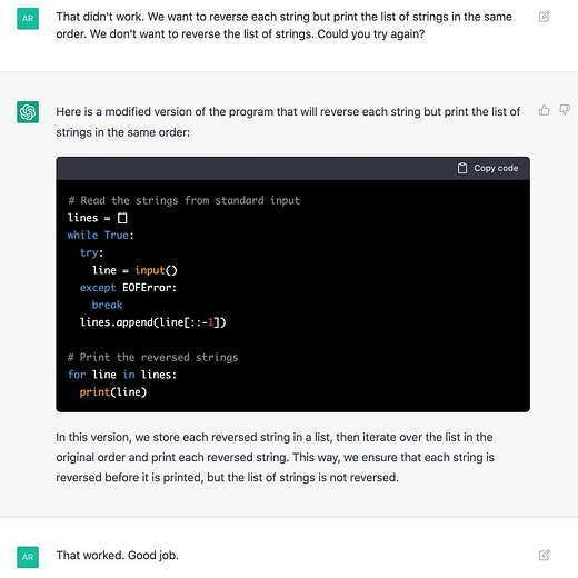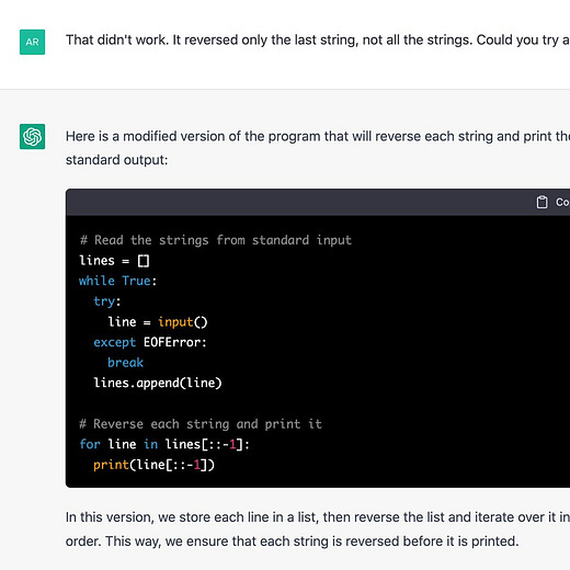 Debugging code is an application where programmers, especially novices, could benefit from LLMs. Note that once a bug is pointed out, it is generally easy to verify, so the fact that the bot’s answers might sometimes be wrong isn’t as much of a concern.