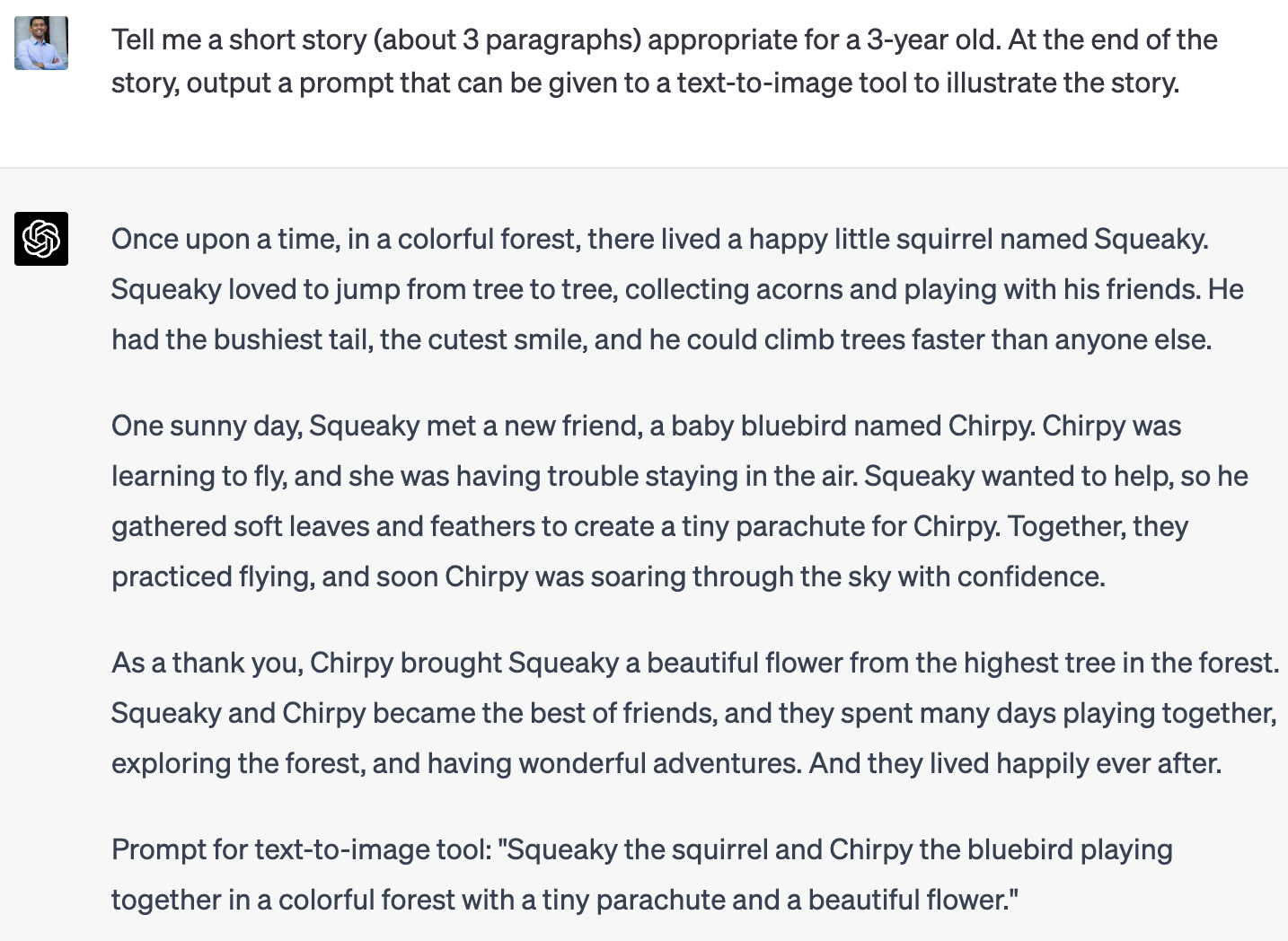 ChatGPT is in some ways better than people and in other ways worse than people at telling stories to 3-year olds. When you simply ask it to tell a story, the stories it tells have a formulaic structure. I’ve also seen reports that its stories reflect gender stereotypes. I don’t doubt this, but it hasn’t happened so far (and if it does, I’m confident that it’s avoidable by modifying the system prompt).