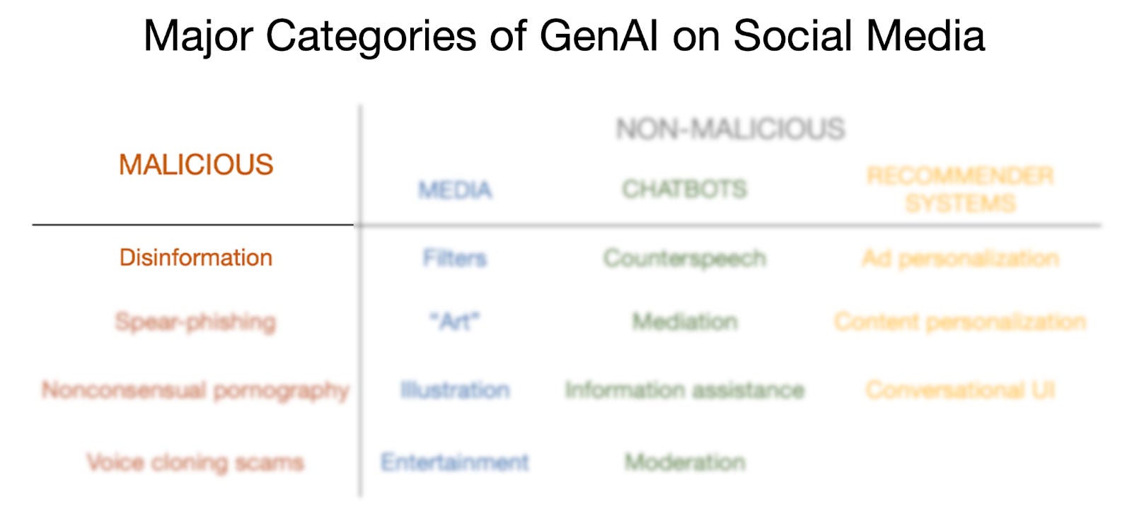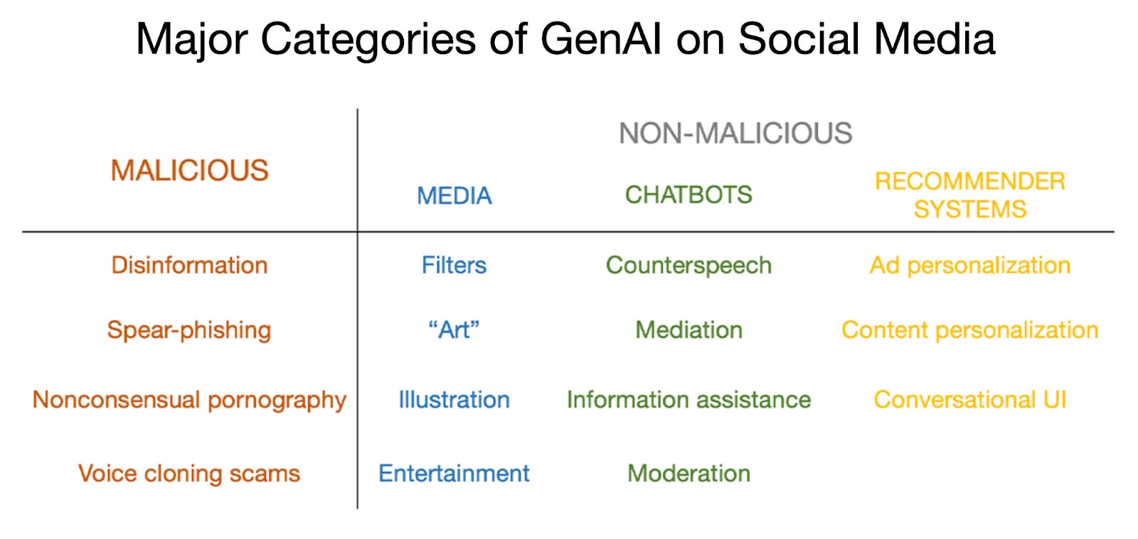 With this in mind, we analyze many types of non-malicious synthetic media, describe the idea of pro-social chatbots, and discuss how platforms might incorporate gen AI into their recommendation engines. Note that non-malicious doesn’t mean harmless. A good example is filters on apps like Instagram and TikTok, which have contributed to unrealistic beauty standards and body-image issues in teenagers.